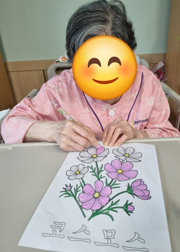 어르신들은 "코스모스 색칠하기"를 하였는데요.